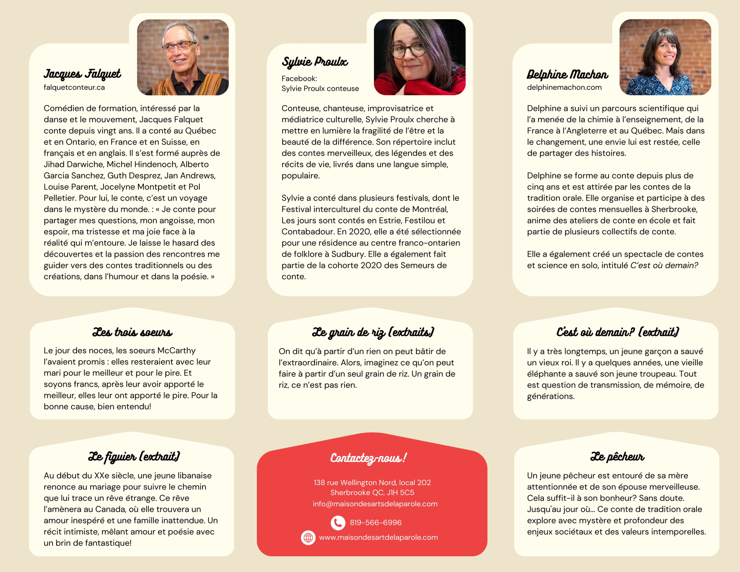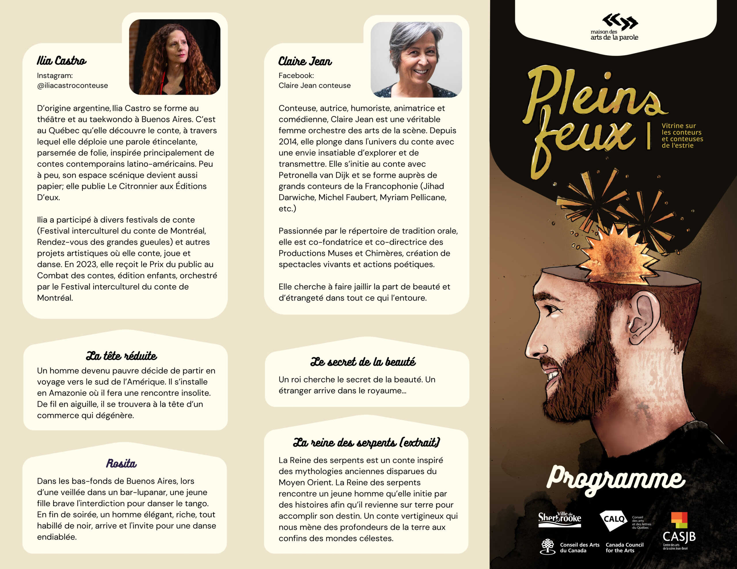 Boursière au CAC et au CALQ pour des projets contés et passionnée par le répertoire de tradition orale, elle a conté en solo, en duo et en collectif, notamment au Festival interculturel du conte de Montréal, au festival Les jours sont contés en Estrie, au Festilou, au festival Graines de paroles en Martinique et aux Rencontres internationales des arts de l’oralité au Bénin. Claire est co-fondatrice et co-directrice des Productions Muses et Chimères, création de spectacles vivants et actions poétiques.